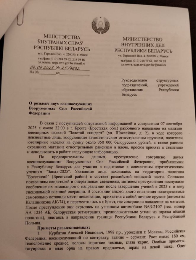 Двое российских военнослужащих якобы ограбили ювелирный магазин в белорусском Бресте, следует из электронных писем с ориентировкой, которые рассылались от лица МВД страны.