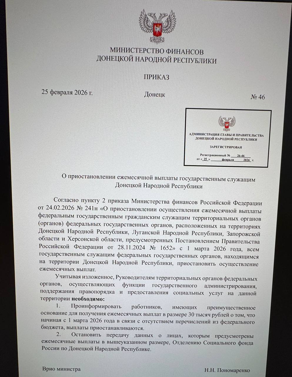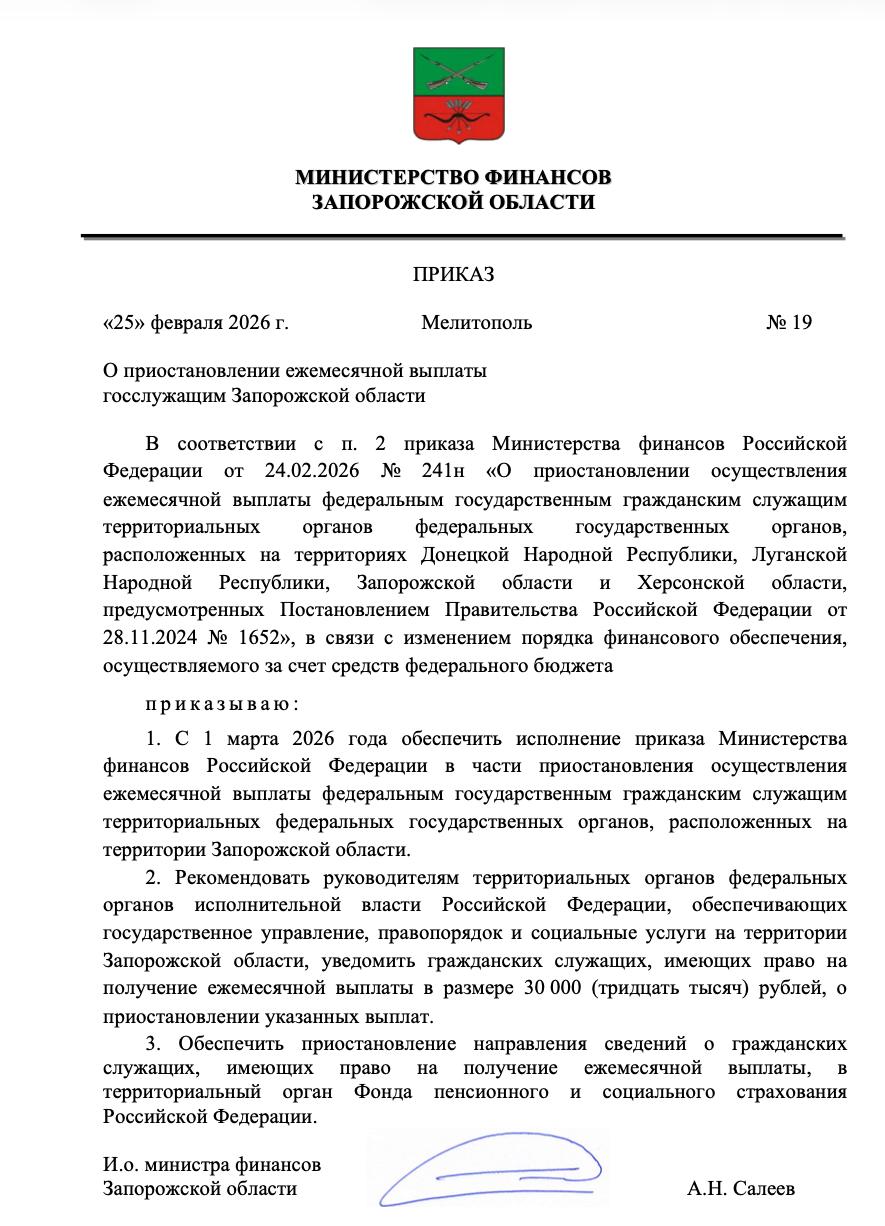 Министерство финансов Запорожской области опровергло новость об отмене выплат, отметив, что данный приказ ведомством не издавался: «Действующие приказы Министерства финансов публикуются только на официальном сайте и не распространяются в формате скриншотов в социальных сетях».
