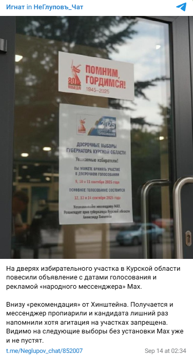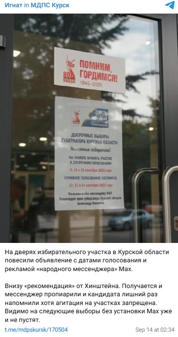 На двери одного из УИКов в Курской области якобы присутствует реклама мессенджера MAX и агитация за действующего врио региона Александра Хинштейна. Соответствующий снимок расходится по чатам.