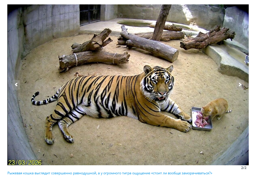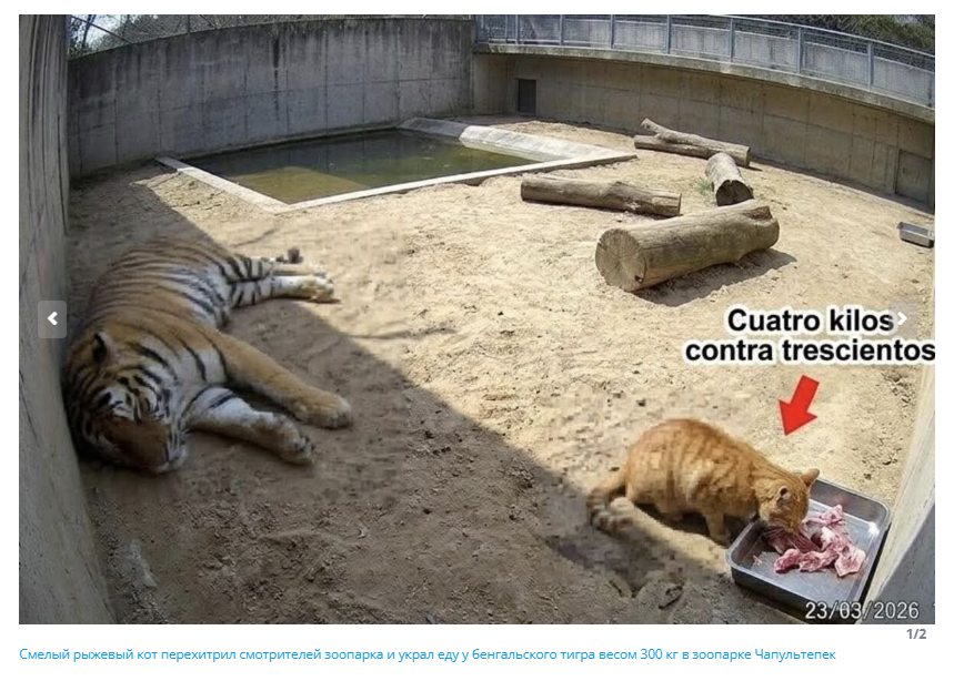 В Сети описывают удивительную история: якобы рыжий кот повадился ходить к бенгальскому тигру в зоопарке Мексики и на протяжении четырех месяцев ворует у полосатого хищника мясо.