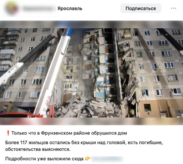Пользователей призывали перейти по ссылке, чтобы узнать о подробностях инцидента. Фото же было взято с новости о взрыве газа в жилом доме в Магнитогорске 31 декабря 2018 года.