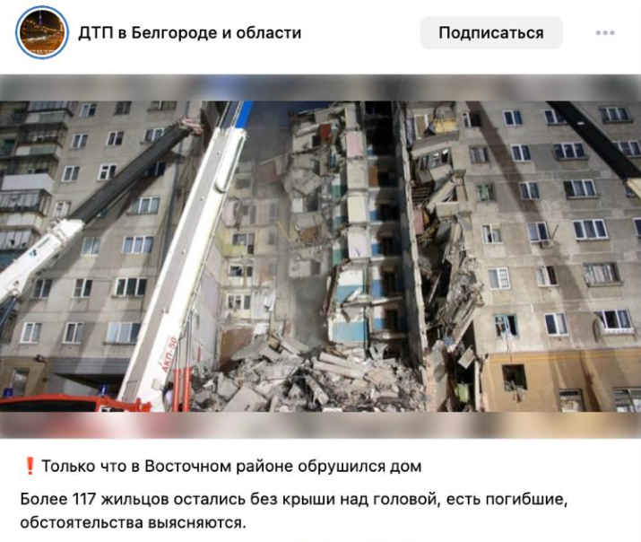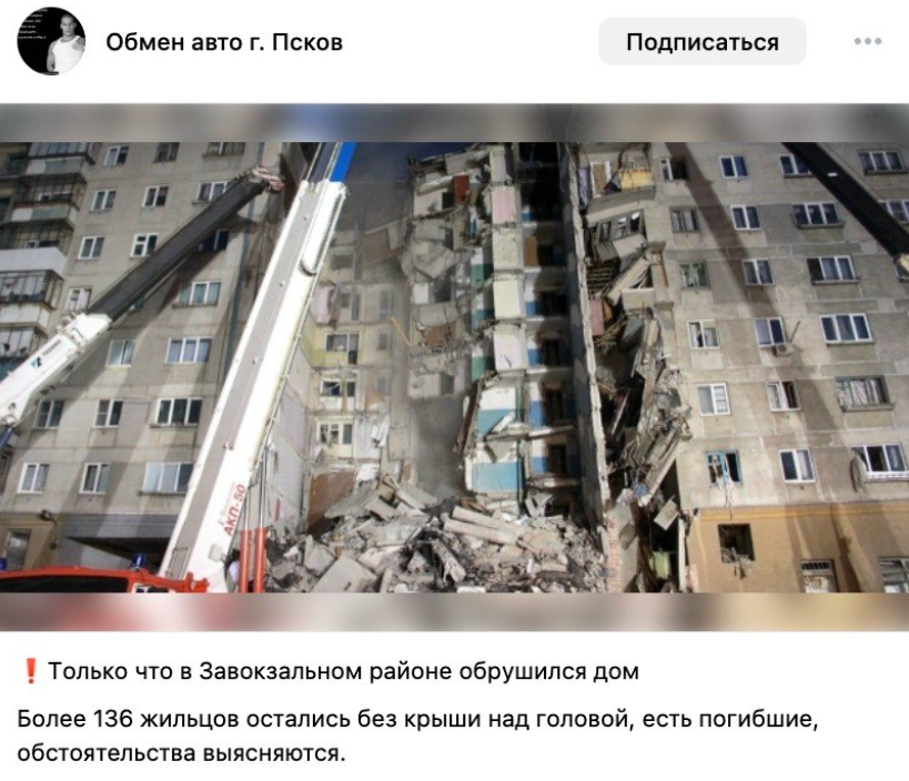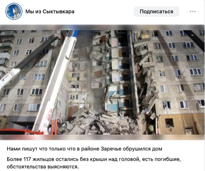 В соцсетях распространяется идентичная информация об обрушении многоквартирных домов в Пскове, Белгороде, Сыктывкаре, Ярославле и других городах России. Утверждается, что более сотни человек остались без крова, есть погибшие. Посты иллюстрируются одним и тем же фото.