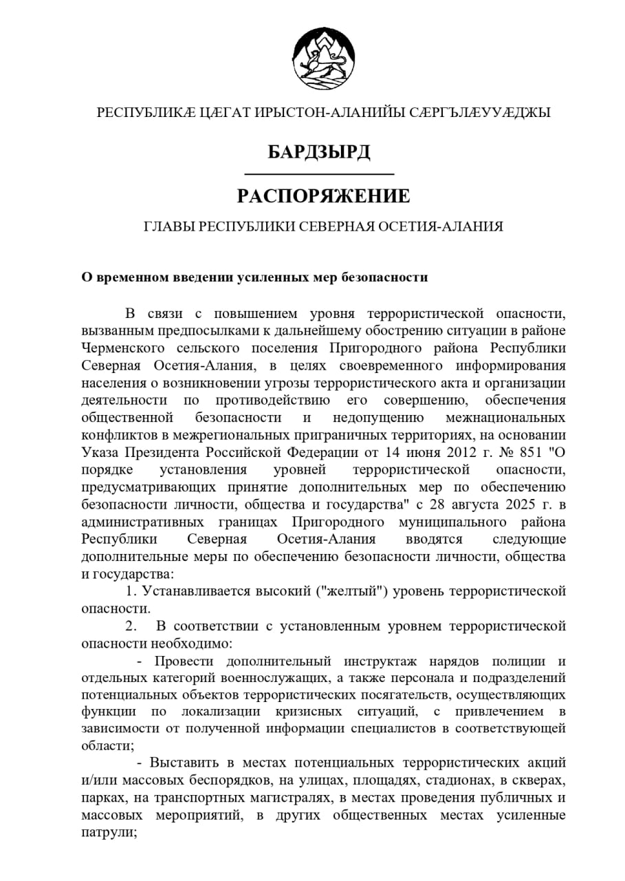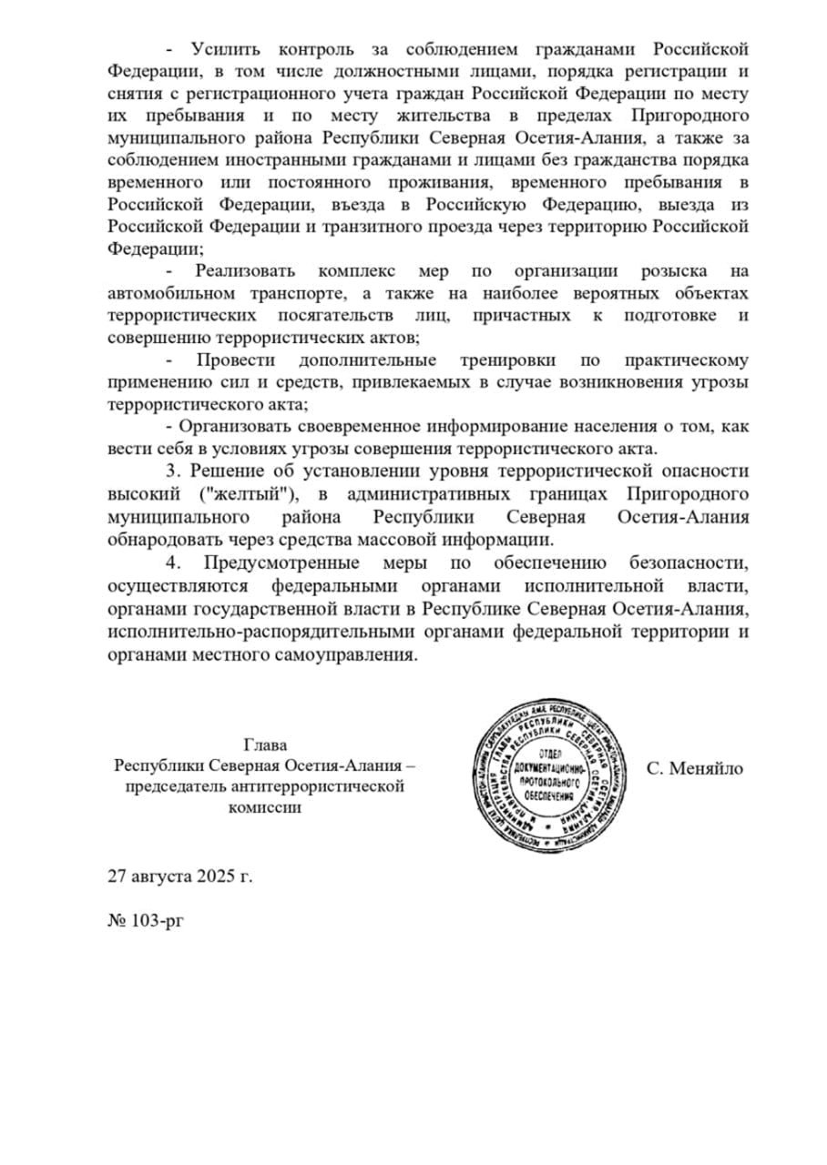 Центр управления регионом Республики Северная Осетия-Алания заявил, что глава региона Сергеем Меняйло постановлений или распоряжений о повышенном риске терактов не издавал. Все официальные распоряжения и указы в обязательном порядке публикуются на официальном сайте правительства региона и имеют свой номер. Подобного распоряжения в официальных источниках нет.