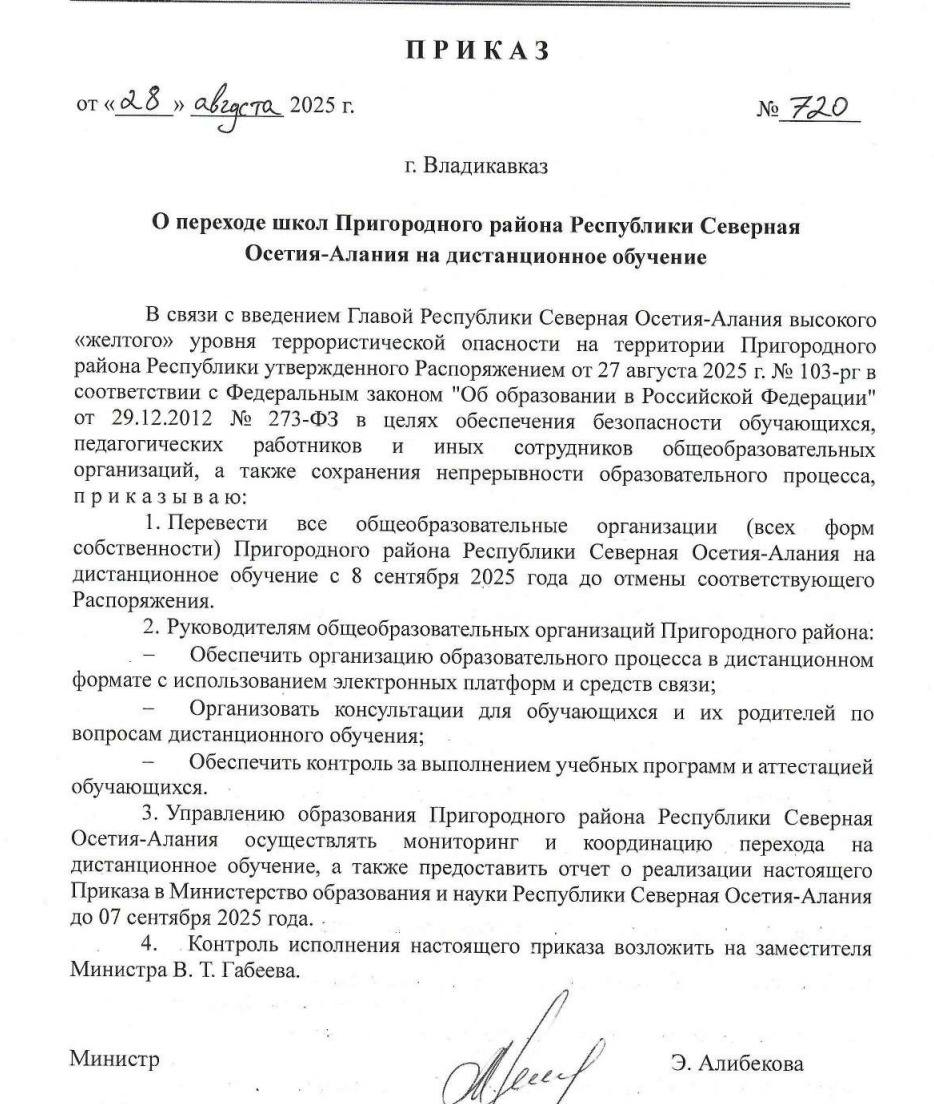 В Пригородном районе Республики Северная Осетия-Алания якобы объявлен высокий («желтый») уровень террористической опасности, школы района отправляют на дистанционный формат обучения в связи с угрозой. Об этом свидетельствуют документы от имени главы и министра образования региона, распространяющиеся в соцсетях.