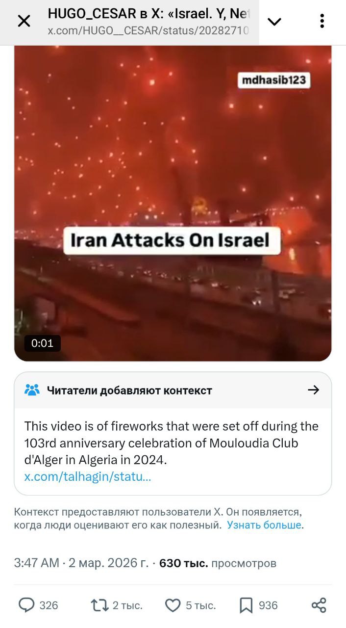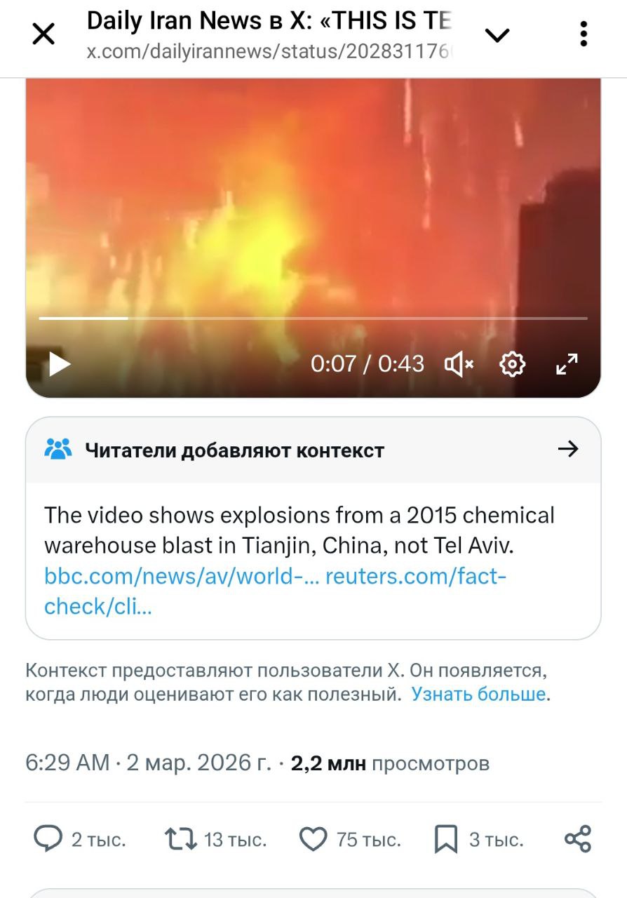 Аналогичным образом якобы видео взрывов в Тель-Авиве в результате ударов Ирана на самом деле оказалось архивными кадрами детонации складов в китайском Тяньцзине в августе 2015 года. Соответствующая пометка о недостоверности поста появилась в соцсети.