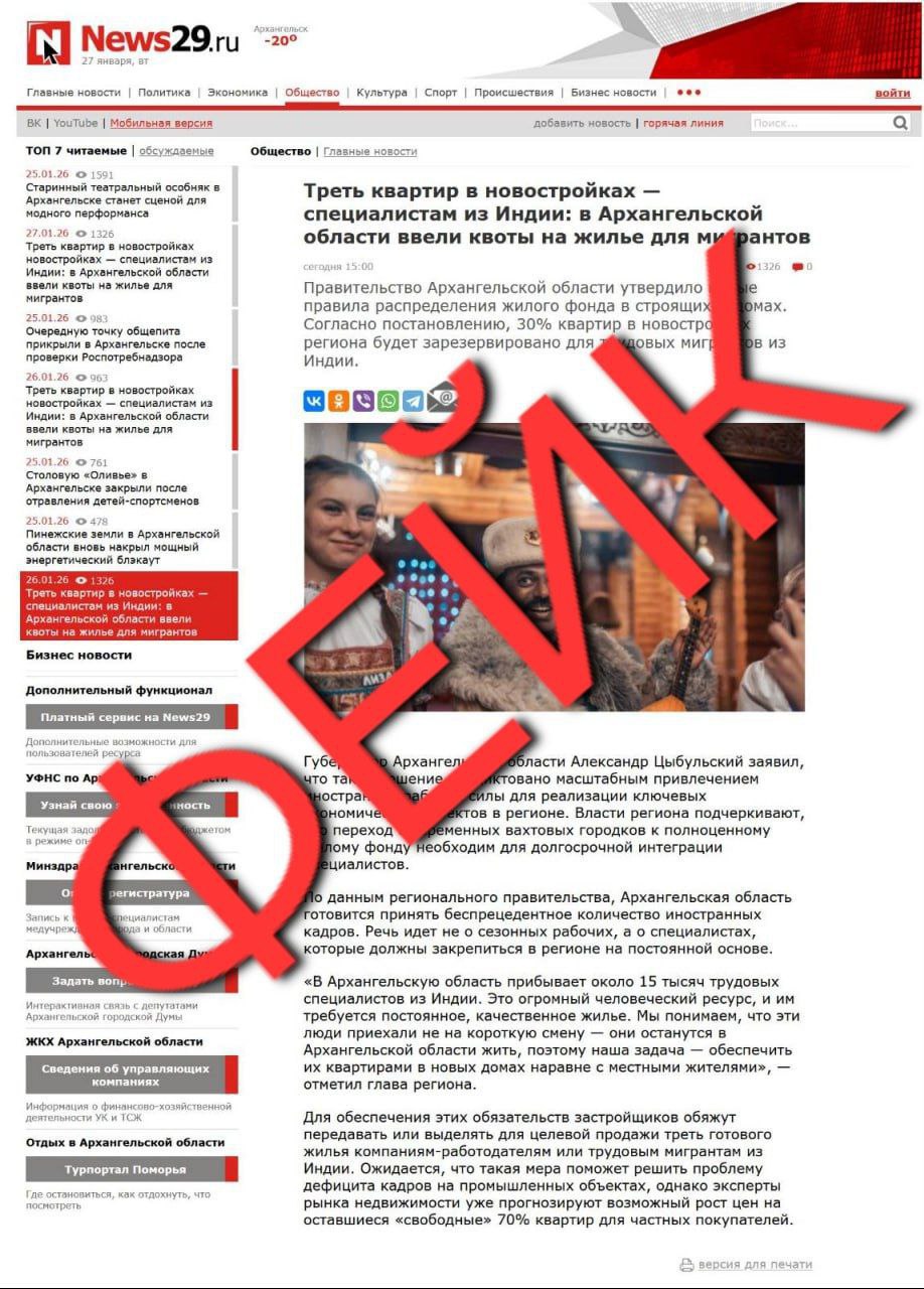 В Архангельской и Свердловской областях, а также в ряде других регионов России якобы зарезервируют 30% квартир в новостройках для трудовых мигрантов из Индии, свидетельствуют «скриншоты» СМИ. Утверждается, что иностранные специалисты получат жилье бесплатно.